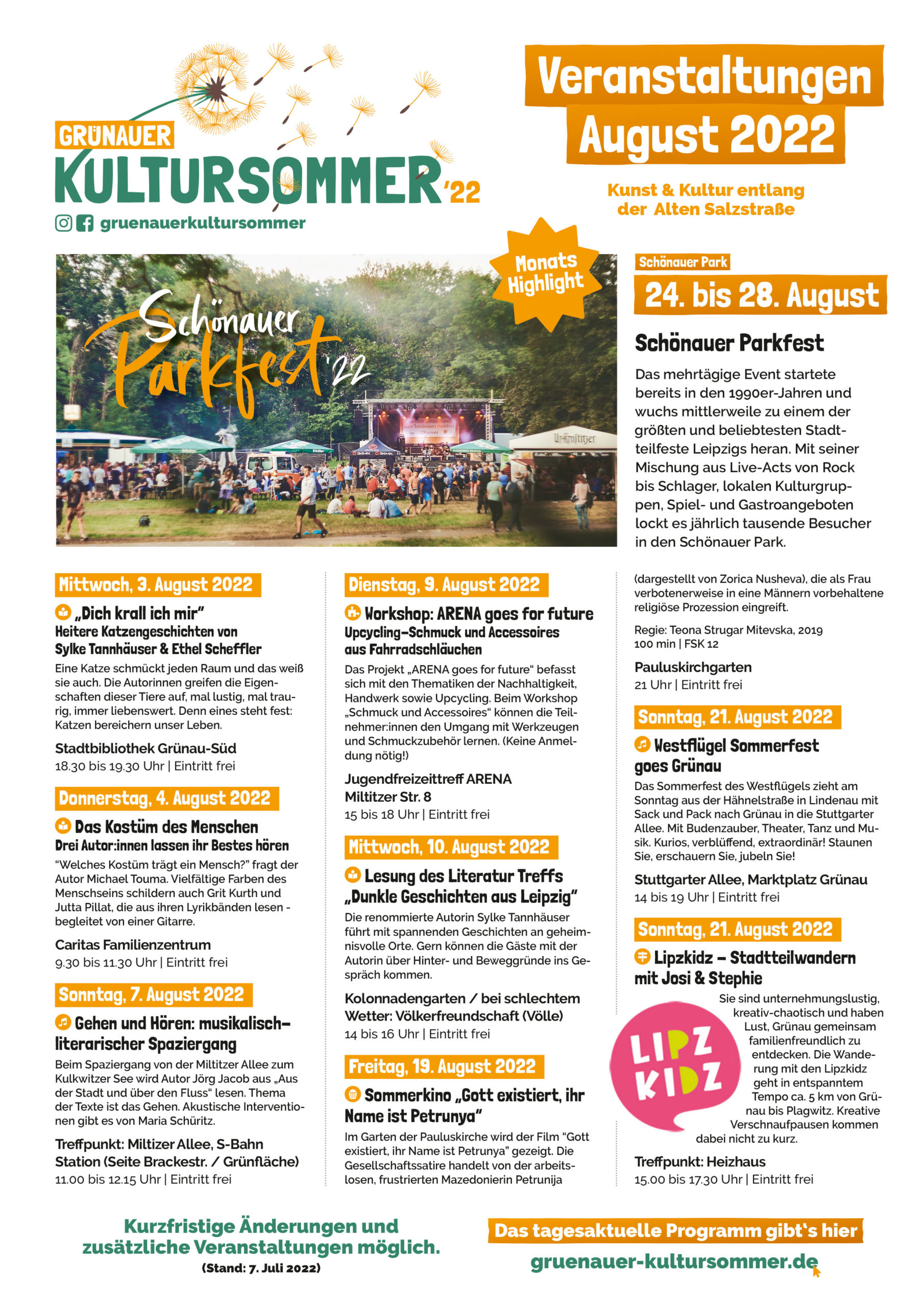 Es sind zwar Sommerferien und trotzdem zeigt sich Grünau kulturell vielfältig! Das Highlight im August ist ganz klar das beliebte „Schönauer Parkfest“, (besonderer Tipp: nutzt die Gelegenheit und genießt in diesem Zusammenhang  das Angebot der „Offenen Kirche“). Darüber hinaus lockt u.a. das „Sommerfest Westflügel goes Grünau“, eine Familienfreundliche Stadtteilwanderung der Lipz Kidz, eine musikalisch-literarische Wanderung mit Maria Schürzitz & Jörg Jacob, Lesungen, Konzerte und Sommerkino! Der August wird toll, genießt Kultur im Sommer in Grünau und holt euch hier den Veranstaltungsüberblick Grünauer  Kultursommer – August 2022 als PDF.